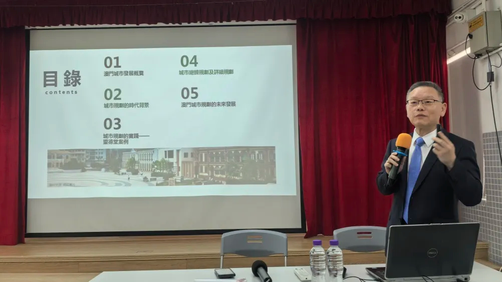 崔博士以輕鬆有趣的語言,深入淺出地介紹了澳門城市發展概況,以及城市規劃如何融入文化特色、城市肌理等內容,並以望德堂區為案例,詳細說明了城市規劃中需考慮到的交通組織、功能佈局、配套建築等內容,加深師生對澳門的獨特魅力和城市規劃藍圖的認識,令眾人獲益良多。在講座末尾的提問和交流環節中,崔博士更從專業角度,提供相關職業建議,相信能夠提升同學們對相關行業的興趣與理解,為未來職業生涯的選擇提供幫助。