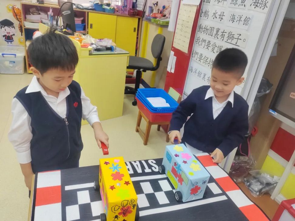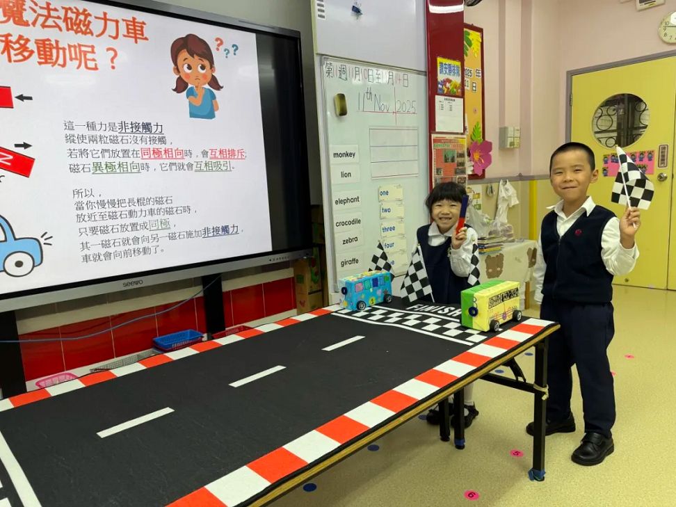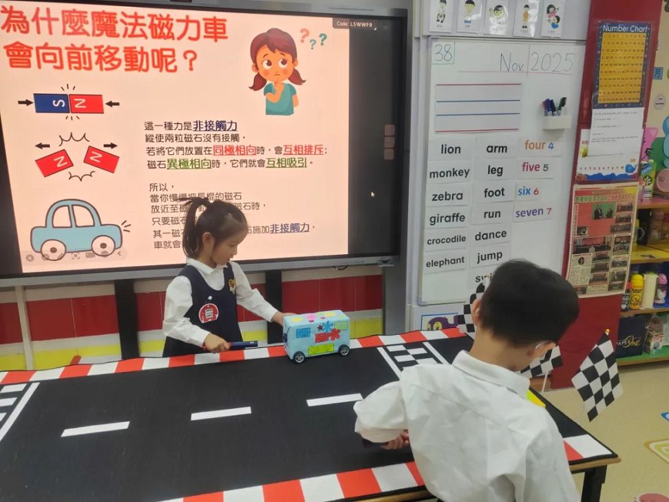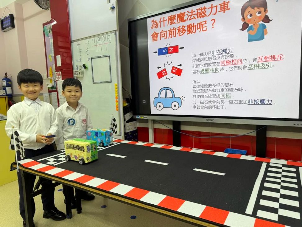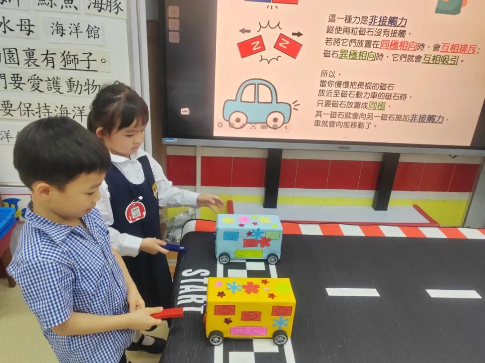 課堂上,老師利用他們自製的磁力車以深入淺出的方式,讓小朋友能發現只要將磁石與磁力車正確地排列好,磁力“吸”和“斥”的作用便會使車子有前進或後退的效果,彷彿有一雙「隱形的手」在幫忙。