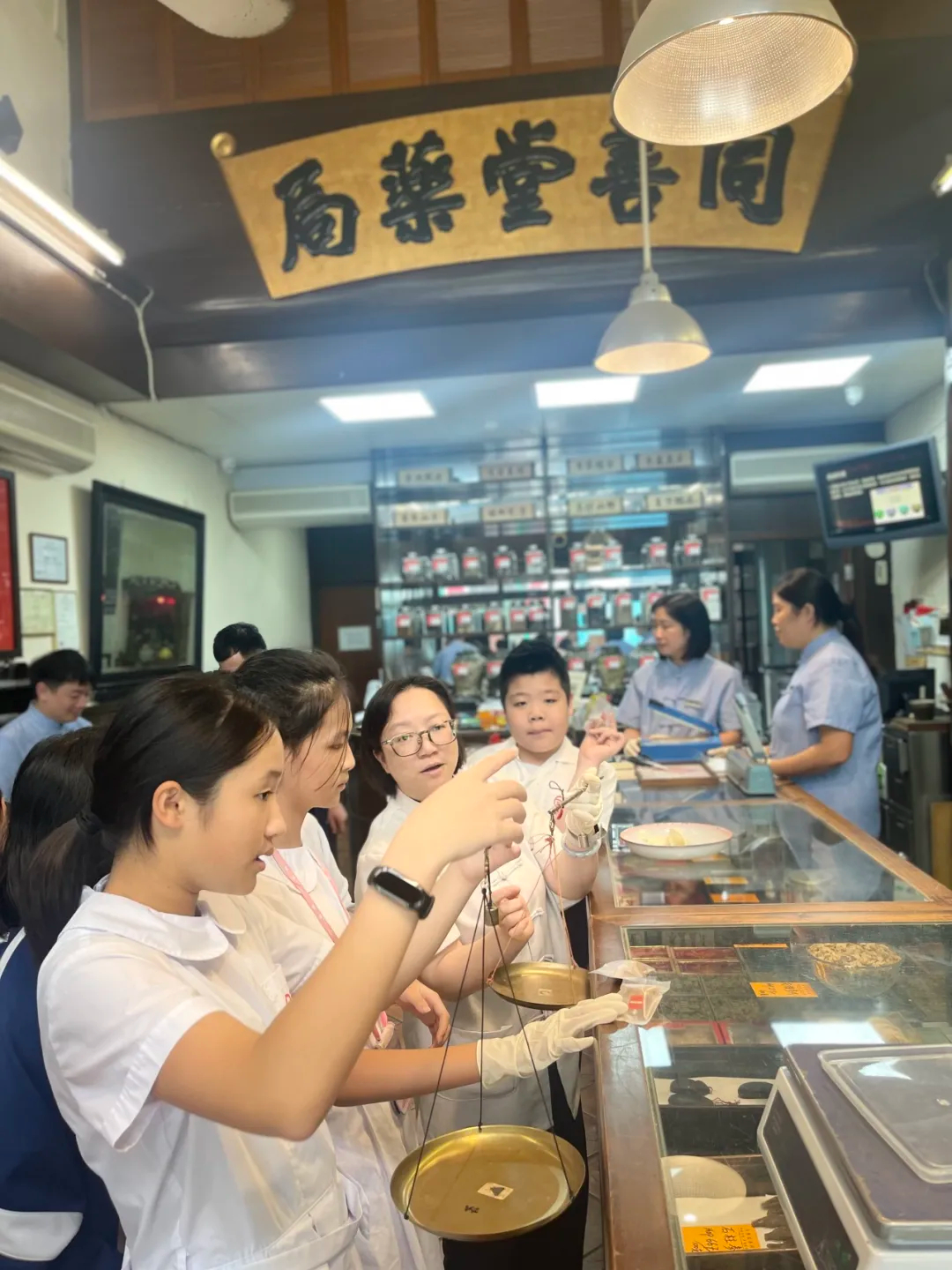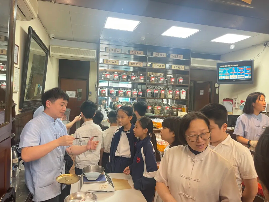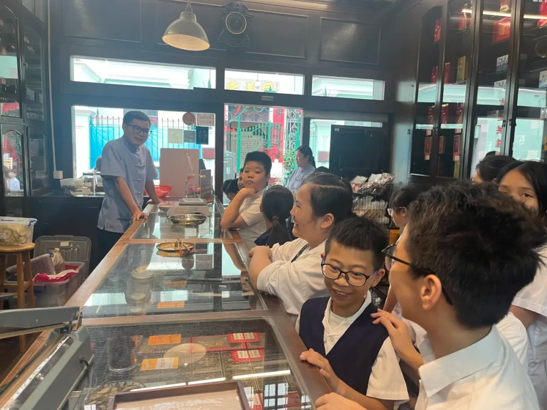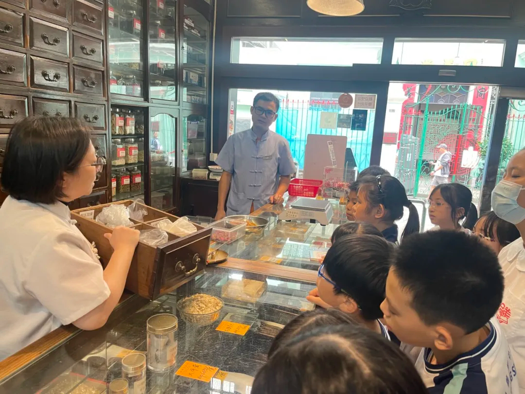 一走進藥局,古色古香的「百子櫃」瞬間吸引了同學們的目光。藥局工作人員娓娓道來每個抽屜背後的故事,解釋「百子櫃」如何以嚴謹的分類與記憶,承載著數百味中藥的智慧。同學們聽得入神,不時發出驚嘆:「原來一味藥一個家!」